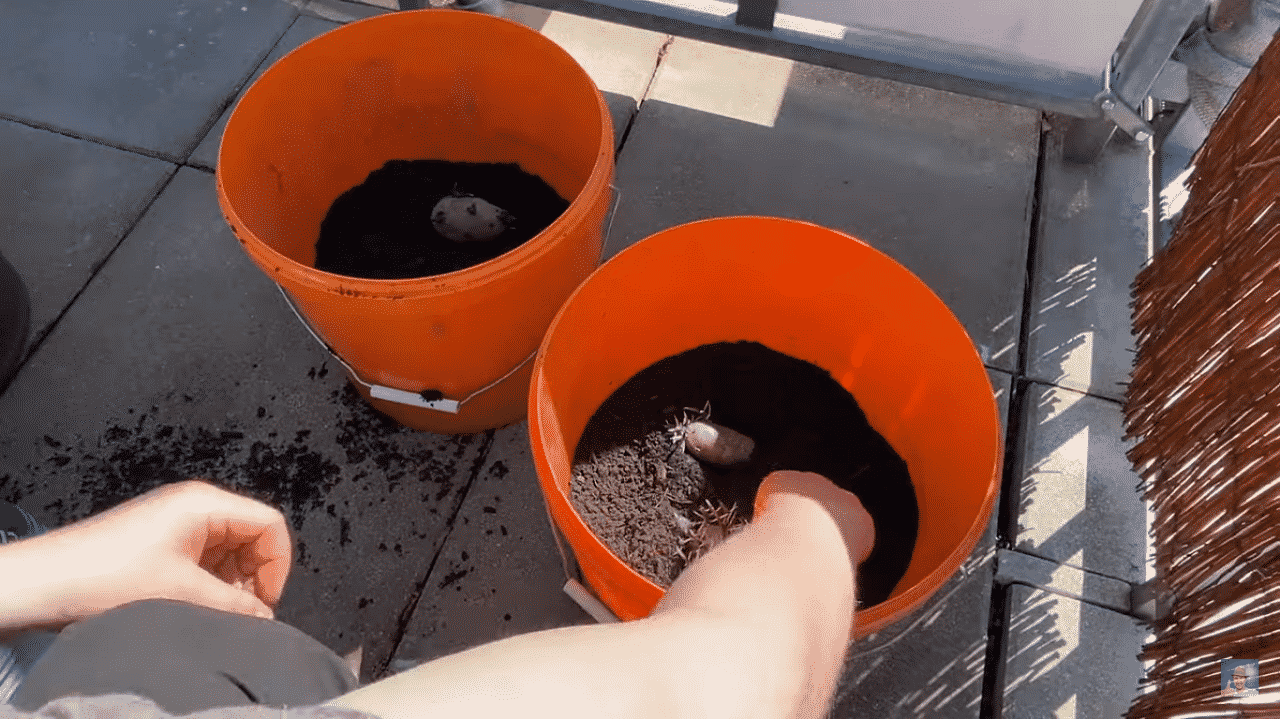Wer es ganz üppig haben möchte, stellt drei Maurerkübel übereinander, wobei die beiden oberen keinen Boden haben dürfen. Diesen kannst du herausschneiden, und so den untersten Kübel nach oben verlängern. Maurerkübel haben dabei noch einen weiteren Vorteil: sie sind schwarz, und profitieren daher von der Sonneneinstrahlung, die die Pflanze und den Boden erwärmt.