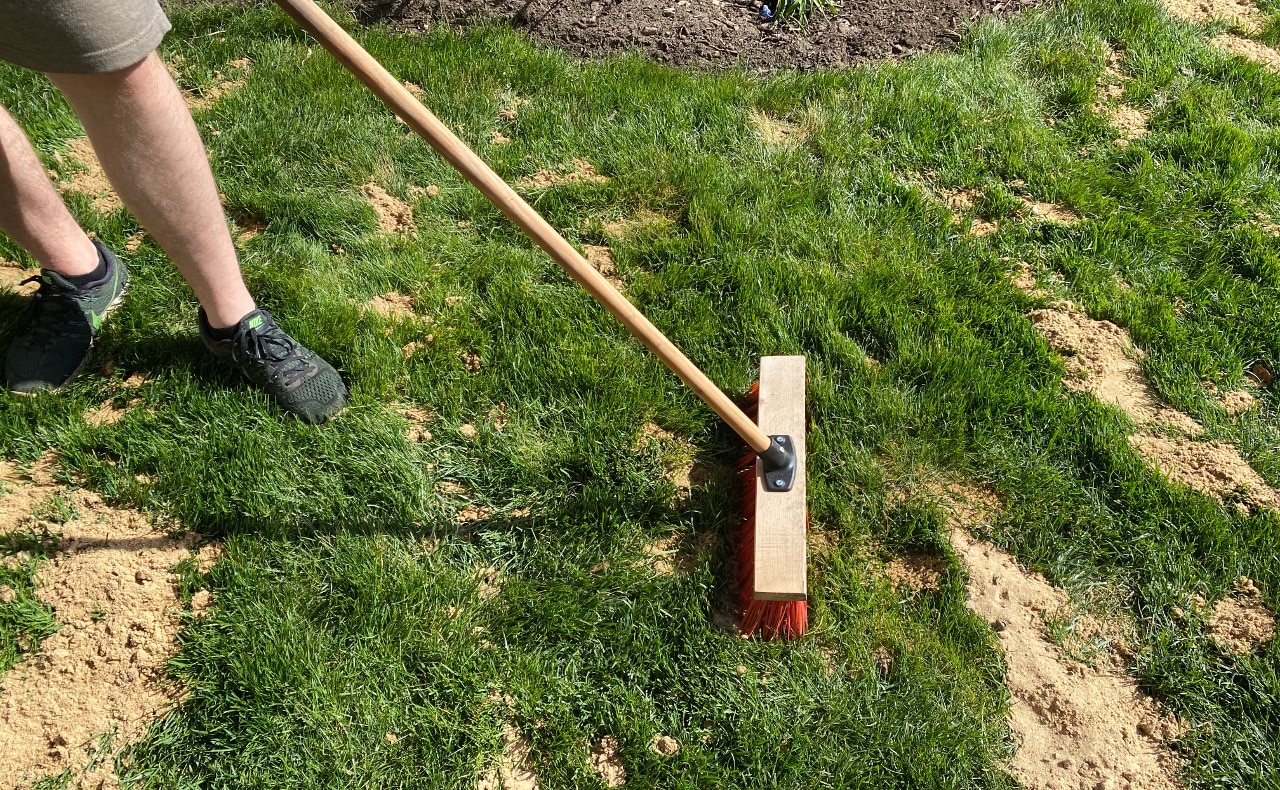 Die Rasenerde wird am einfachsten mit einem Rechen verteilt. Die Zinken verteilen die Rasenerde grob und lassen sich so gut durch das Gras ziehen. Die gerade Rückseite des Rechens wird dann für den Feinschliff genommen, um die Rasenerde glatt zu streichen. Dies wird so lange gemacht, bis die Rasenerde eben und glatt verteilt ist und gut in die Lüftungsschlitze gesackt ist. Das Gras sollte dann immer noch einige Zentimeter sichtbar sein.